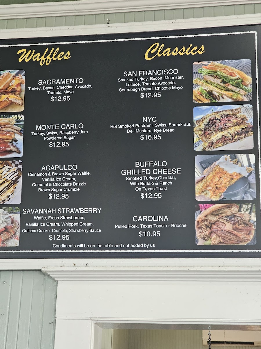Waffle topped with fresh sliced strawberries, graham cracker crumble, strawberry sauce drizzle, powdered sugar, 2 scoops vanilla ice cream, whipped cream.