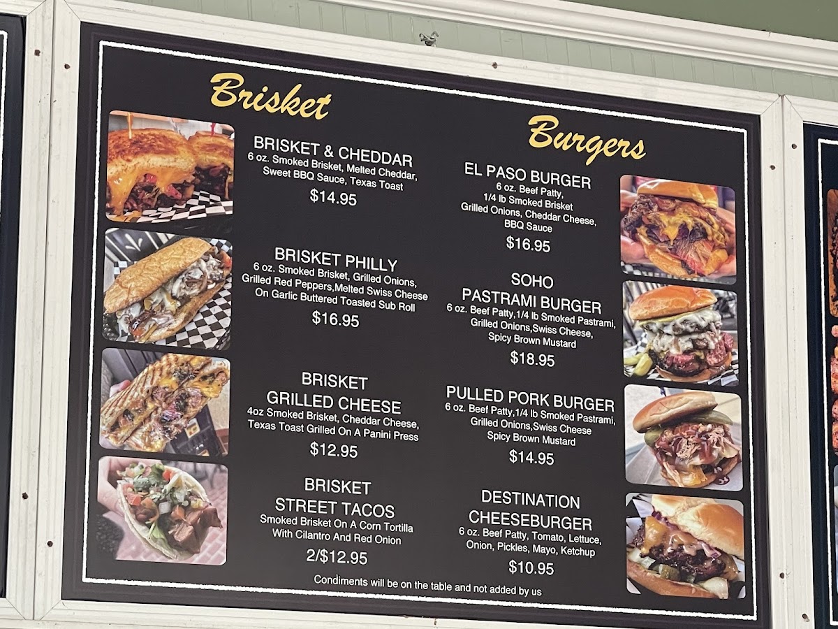 6 oz smoked beef patty, 4 oz smoked brisket, grilled onions on garlic toasted brioche bun with sweet BBQ sauce.