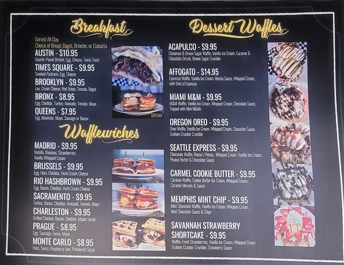 Waffle topped with brown sugar, cinnamon, chocolate sauce drizzle, caramel sauce drizzle, 2 scoops vanilla ice cream and whipped cream.